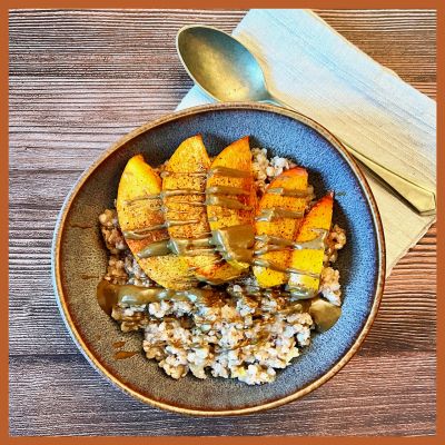 In diesem Rezept kombiniere ich ihn mit Apfel, gerösteten Haselnüssen und gebratener Kaki. Eine einfache, warme Frühstücksschale, die nährt, wärmt und richtig gut in den Herbst und Winter passt.