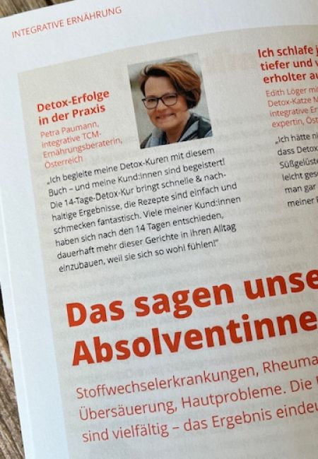 „Nach der Detox-Kur fühle ich mich leichter, gesünder, wach, konzentriert, gut gelaunt, entspannter, ruhiger. Mein Hautbild und die Stimmung haben sich verbessert. Achtsamkeit, Freude und Genuss beim Essen haben sich eingestellt. Petra motiviert mit Herz und Verstand und antwortet auf alle Fragen wirklich schnell! Die Kur ist ein super Start für bessere Ernährungsgewohnheiten.“
